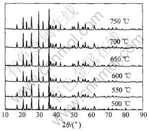 Fig.1 XRD patterns of LiFe0.9Ni0.1PO4 synthesized at different reaction temperatures for 8h