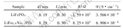 表1 样品LiFePO4 和LiFe0.9Ni0.1PO4的电导率
