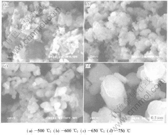 Fig.3 SEM morphologies of LiFe0.9Ni0.1PO4 synthesized at different reaction temperatures for 8h