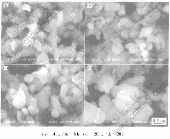 图4所示为在650℃不同反应时间合成的LiFe0.9Ni0.1PO4的SEM形貌。 从图中可以看出合成时间对LiFe0.9Ni0.1PO4表面形貌影响并不显著。 8h和20h合成的样品的形貌差别不大, 但当合成时间增加到28h时, 颗粒明显长大。