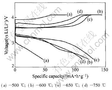 Fig.6 First charge-discharge curves of LiFe0.9Ni0.1PO4 synthesized at different reaction temperatures for 8h