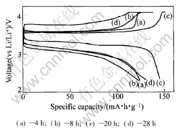 Fig.7 First charge-discharge curves of LiFe0.9Ni0.1PO4 synthesized at 650℃ for different reaction time