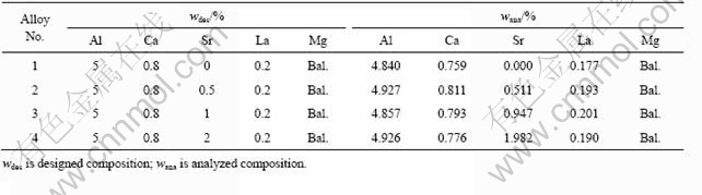 本实验以纯Mg(99.8%)、Al(99.3%)、Ca(99.9%)、La(99.8%)和自行熔制的Mg-Sr中间合金为原料,用25 kg真空电阻炉熔化、精炼、无氧化金属型重力铸造制备了4种合金,其化学成分如表1所列。