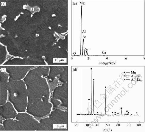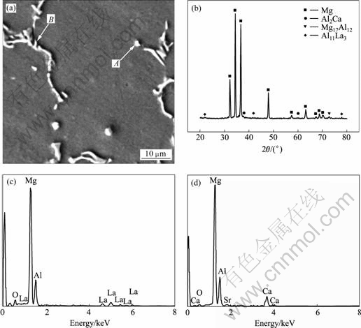 Fig.1 SEM image and phase analysis of Mg-5Al-0.8Ca-0.2La alloy: (a) SEM image of alloy 1; (b) XRD pattern of alloy 1; (c) EDS pattern of point A; (d) EDS pattern of point B