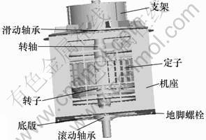 (3) 轴承装置是保证转子正常旋转并保持定、转子相对位置不变或处于所限定的范围之内的机械结构,通常采用滑动轴承或者滑动-滚动轴承支承方式,用轴承座固定在底板上。