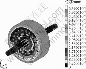 图4所示为第3阶固有模态振型云图,固有振动频率为92.1 Hz。对比分析图3和图4可知:第3阶固有模态振型与第2阶固有模态振型相似,只是在相位上相差90°;第3阶固有振动对电动机运行的影响也与第2阶固有振动的影响相似。