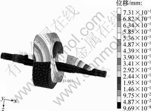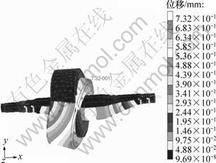 对该立式电动机转子系统前10阶固有模态进行仿真分析。由于转子系统的前3阶固有振动对其运行工况具有十分重要的影响,所以,取前3阶固有模态的位移云图进行分析。图2~4所示分别为前3阶固有模态的位移云图,云图中颜色最深的图形是转子系统原始位置图形,另一个斑马条纹转子图形是变形后的转子系统图形。