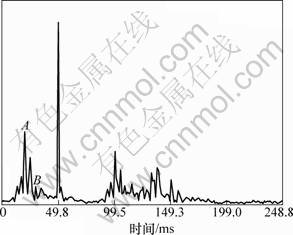 所用试验仪器为DH5922动态信号测试分析系统,对YKSL1730立式电动机进行空载振动实验。实验工况分别为开机、空载平稳运行和停机共3种,测得的实验数据为时域信号,每一次测试时间为0.8 s。图5所示为其中的一组信号,其中横坐标为测试时间,纵坐标为被测信号的幅值,振幅越大,该值越大。利用动态信号测试分析系统的分析软件对该信号进行频谱分析,获得相应的频谱图如图6所示。结合传感器所在位置和多组信号比较分析,图6中频率为20.0 Hz和30.0 Hz的2个峰值(见图6中点A和B)分别为整机的第1和第2阶固有振动频率,频率为25.0和50.0 Hz的2个峰值均为干扰频率,频率为36.3,56.3和81.3 Hz的3个频率均不是尖峰频率,频率为52.5,93.8和96.3 Hz的3个峰值均为尖峰值,是转子系统前3阶固有频率的实验值。将实验结果与仿真结果进行比较,结果如表1所示。经过比较分析发现:仿真结果与实验结果比较相近,前3阶固有频率的相对误差都在10.0%以内。这表明模态仿真结果是可靠的。