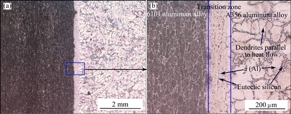 2) There is a transition zone between the two bonded aluminum alloys, the fine equiaxed grained structure in the transition zone is due to the high undercooling during solidification.