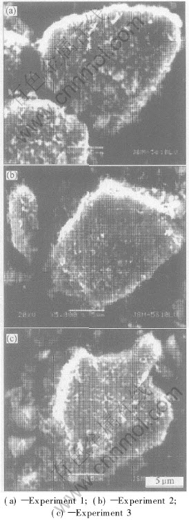 Fig.2 shows the surface morphologies of coated powders under conditions of different treatment time and different rotation speeds. The particles have got coated when treatment time is 5min in experiment 1 and have hardly any improvement in their coating effects while the treatment time is prolonged to 10min in experiment 2. This result accords well with foregoing analysis about the changes of temperature. So we think 5min is enough to realize coating in this system.