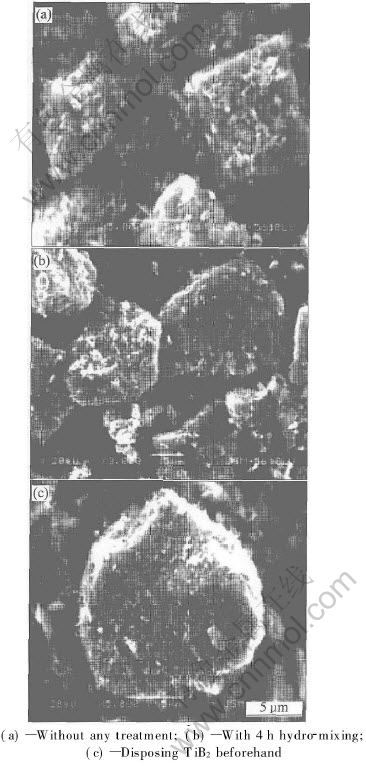 Pretreatment of material will have apparent influence on coating. As Fig.4(a) shows, the coated powders without any pretreatment get scarcely any change to roundness and many fine particles dont gain attachment to larger core particles. Mixing of TiB2 and BN in a planet ball mill for 4h can facilitate coating(Fig.4(b)) and disposing of TiB2 solely beforehand can make well-coated powders(Fig.4(c)).