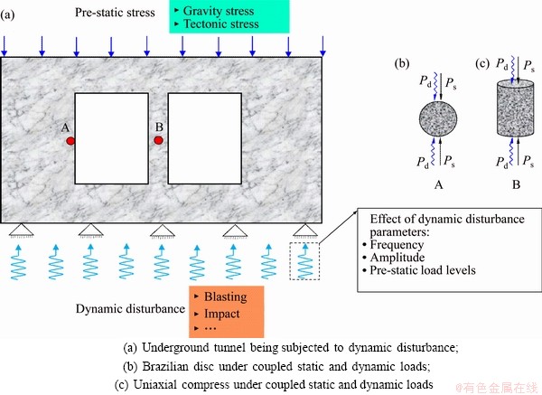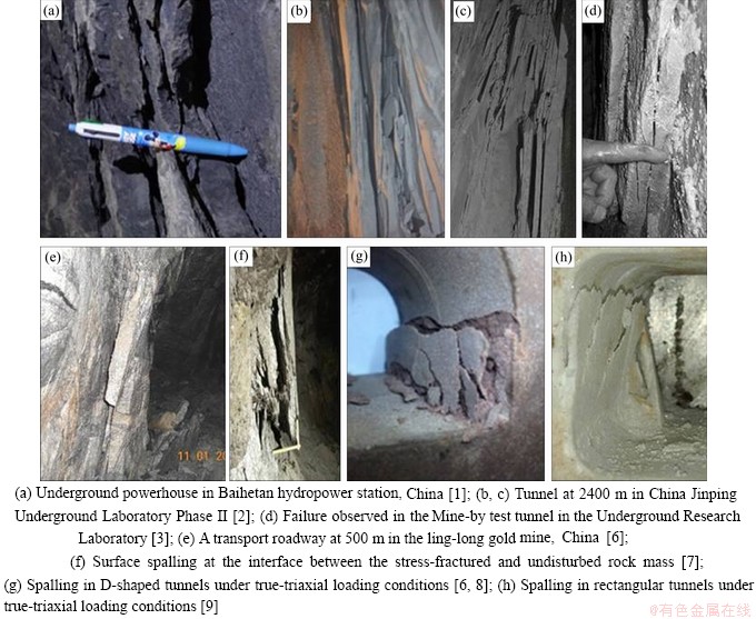 During the excavation of many deep hard-rock tunnels, obvious spalling (or slabbing) failure is often observed at the tunnel sidewall (Figure 1) [1-5]. The spalling is essentially a typical tensile failure phenomenon in deep engineering or laboratory tests [1, 2, 6-15]. For example, HE et al [11] had performed a true triaxial test using cubic sandstone specimens with a circular hole and observed the tension failure of the rock plate on the sidewall. Furthermore, GONG et al [10, 12, 14], LUO et al [6, 8] and WU et al [9] carried out a series of indoor true triaxial tests on circular, rectangular or D-shaped tunnels and observed obvious tensile failure of sidewalls, which is consistent with the tensile failure mode of sidewalls of the deep underground cavern (Figure 1). ZHOU et al [13] conducted a study on the influence of curvature radius of tunnels excavation section on slabbing of the deep tunnel. To study the stress state during the tensile failure of the hard-brittle tunnel sidewalls, researchers have carried out a lot of in-situ tests or laboratory physical tests [16-20]. However, it is difficult to reasonably explain the tensile failure phenomena of tunnel sidewalls based on classical rock statics or dynamics theory developed by shallow mining or excavation. In view of this situation, LI et al [21-23] conducted an exploration of coupled dynamic and static loading mechanics. For example, LI et al [21] proposed that the deep rock was affected by high pre-static stress (gravity or tectonic stress) coupled with dynamic loads produced arising from blasting and impact (Figure 2). GONG et al [22, 23] carried out research on one-dimensional and three-dimensional coupled dynamic and static loading tests.