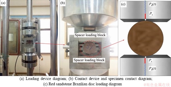 All Brazilian disc tests under the pure static tensile fracture load or “high pre-static load + dynamic disturbance” in this study were performed on the MTS Landmark electrohydraulic servo tester with spacer loading. The MTS Landmark electrohydraulic servo tester is shown in Figures 3(a) and (b), and the loading diagram for the red sandstone is shown in Figure 3(c). The maximum load of the test machine is ±100 kN, the maximum displacement range is ±100 mm, and the dynamic disturbance frequency loading range is 0.01-100 Hz, which meets all accuracy and range requirements of this test.