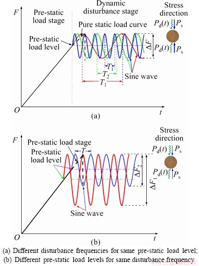 It is noteworthy that in the “high pre-static load+dynamic disturbance” test, the loading rate of the pre-static segment was 10 kN/min, which was consistent with the pure static loading condition. When the set corresponding pre-static level was reached, the sine-wave loading was applied, and then the sine-wave loading was performed according to the test requirements. Figure 4 shows the loading path for the same pre-static load with different dynamic disturbance frequencies (Figure 4(a)) and different pre-static loads at the same dynamic disturbance frequency (Figure 4(b)), where ΔF=2×dynamic disturbance amplitude, and T=1/F (F is the dynamic disturbance frequency). For better controlling the load application process, all dynamic disturbance tests adopted segment loading, i.e., the pre-static load stage was loaded at a rate was 10 kN/min (load-displacement control method) and the dynamic disturbance stage was the displacement control mode with the loading rate of 1 mm/min (displacement-load control method).