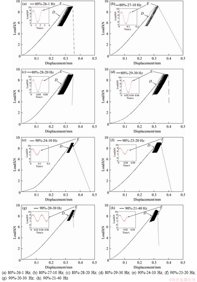 Figure 6 Load-displacement curve of Brazilian disc test with different pre-loads under dynamic disturbance:(80%-26-1 Hz means: 80%-80% of the pure static tensile fracture load, 26-specimen number, 1 Hz-dynamic disturbance frequency)