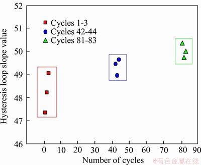 Figure 9 Change in slope values of the hysteresis loop in the early, middle, and late periods of specimen No. 26 (80%-26-1 Hz)