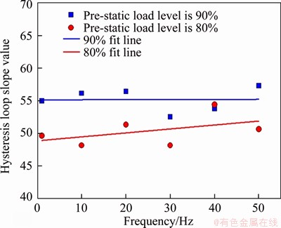 According to the prevision method, the slope of the hysteresis loop between DE of all specimens under different loading conditions was counted, and the average value of nine hysteresis loops of all specimens is shown in Figure 10. As shown, when different dynamic disturbance frequencies were applied at the same pre-static load level, the slope value of the specimen in the dynamic- disturbance- section DE did not change much, i.e., there is no correlation between the dynamic disturbance frequency and the hysteretic loop slope value. Therefore, the effect of increasing the slope value of the DE segment by changing the dynamic disturbance frequency under the same pre-static load is not obvious. However, by increasing the pre-static load levels, the slope value of the DE segment can be significantly improved. For example, the slope value at 90% pre-static strength was higher than the slope value at 80% pure-static load under the same conditions (except at 40 Hz, this may be because at a higher pre-static level, the disturbance amplitude is small, resulting in secondary crack development not very sufficient, and the displacement in one hysteresis loop is small, resulting in a large hysteresis loop slope value).