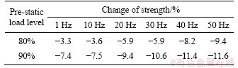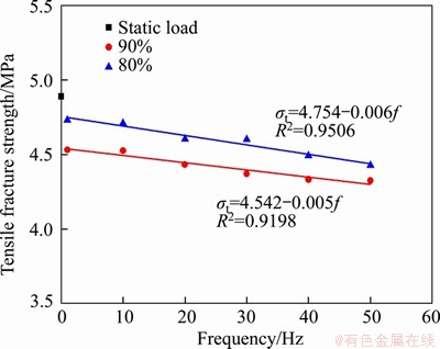 Figure 11 Variation in tensile fracture strength with disturbance frequency under 80% and 90% pre-static loading conditions