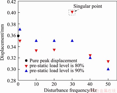 Figure 12 Variation in peak displacement of red sandstone specimens with disturbance frequency under pre-static load conditions