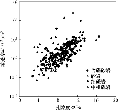 通过对FS1,F8和Y22-22等10余口井的岩心实测物性分析得知:盐家地区沙四段砂砾岩储层孔隙度一般为2.6%~16.5%,平均值为8.74%;渗透率一般为(0.065~278)×10-3 μm2,平均值为5.28×10-3 μm2。同时发现,岩性不同,储层的物性有较大的差异(图2)。砂岩和含砾砂岩的孔隙度分布范围为2%~17%,细砾岩和中粗砾岩的孔隙度分布范围略窄,为2.5%~13.5%,相同孔隙度分布范围内,砾岩渗透率分布范围比含砾砂岩和砂岩的更宽。结合宏微观观察发现:砾岩,尤其是中粗砾岩渗透率异常高样品通常有明显的裂缝发育,表明裂缝发育为砾岩渗透率提高起到了积极作用。