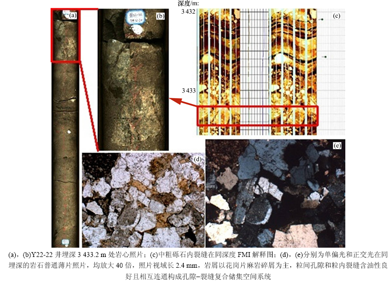 以Y22-22砂砾岩体为例,其主力产层为7小层(图10)。储层评价结果表明:全区除Y22-X8和Y22-X43井外,其余各井平均物性均在有效储层下限之上。其中Y22-42和Y22-X1井区主要发育内扇主沟道微 相,砂砾岩平均孔隙度为4%~6%,基质渗透率为(0.5~1.0)×10-3 μm2,岩心和微观观察表明,其裂缝类型主要为风化缝和成岩缝,为Ⅲ类储层;其他井区主要发育中扇辫状沟道微相,平均孔隙度为4%~10%,基质渗透率为(1~10)×10-3 μm2,岩心和薄片中构造缝和上述各类非裂缝均较为发育,为Ⅱ类储层。综合分析认为,粒度较粗、颗粒支撑、单层厚度适中的中扇亚相辫状沟道砂砾岩中各类裂缝较为发育,裂缝与孔隙交织在一起,构成了沟通良好的孔隙-裂缝复合储集空间系统,是其成为近岸水下扇中最有利的储集相带的重要原因。