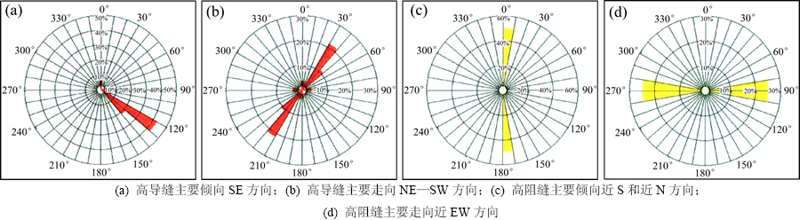 全井眼地层微电阻率扫描成像测井(FMI)裂缝产状统计结果表明:研究区沙四段砂砾岩体高导缝主要倾向SE方向(图5(a)),走向为NE—SW方向(图5(b));高阻缝主要倾向有近S和近N 2个方向(图5(c)),走向近EW方向(图5(d))。
