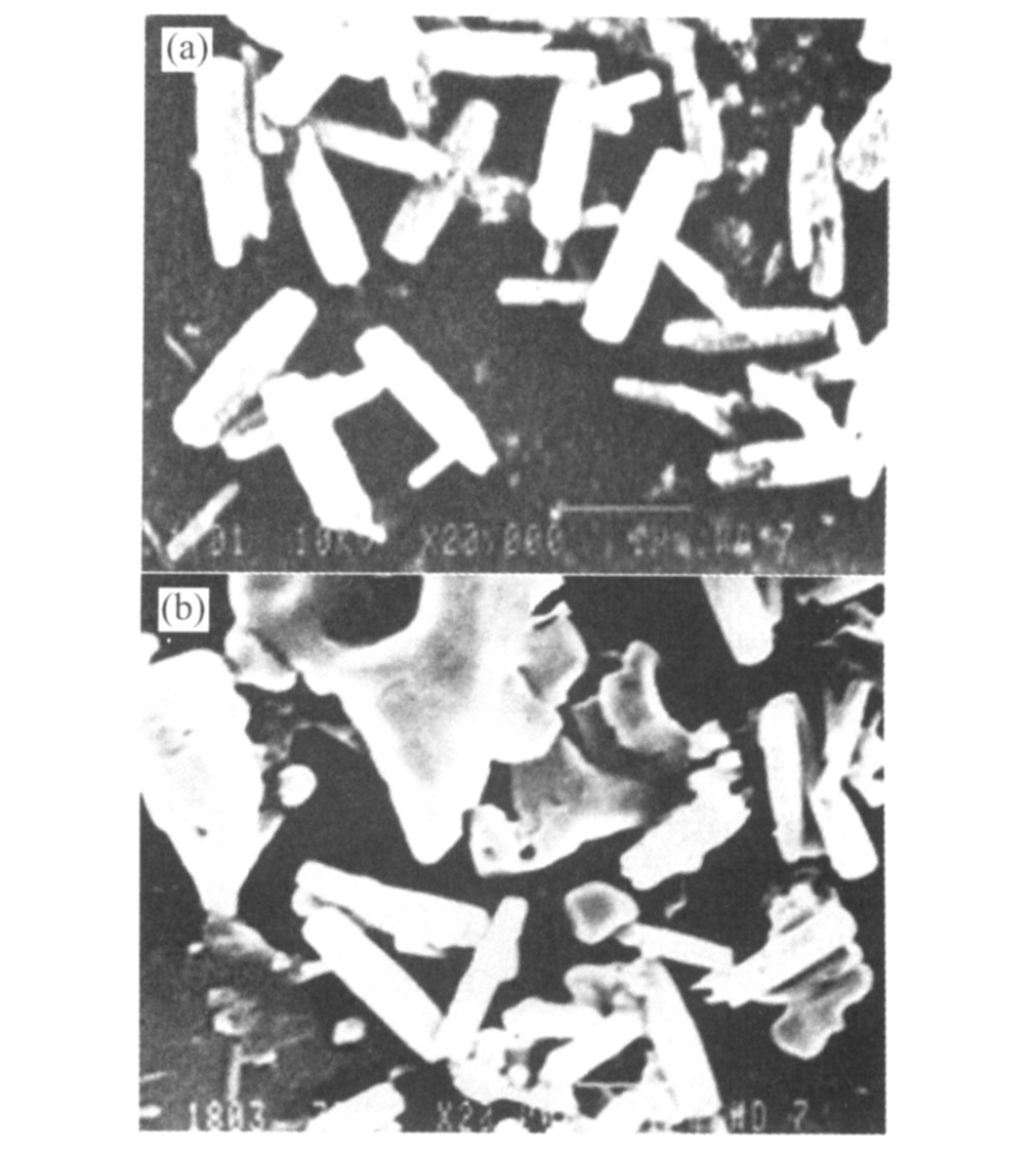 。 瞬间大量沉淀晶核的生成迅速降低了溶液的过饱和度, 从而抑制了二次成核与晶核的进一步长大, 有利于微小颗粒的形成。 同时超声空化作用产生的高温和在固体颗粒表面产生的大量微小气泡也大大降低了微小晶粒的比表面自由能, 抑制了晶核的聚集与长大。 另外超声空化产生的冲击波和微射流对颗粒的剪