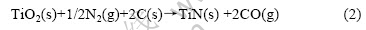 <0,因此,在1 200 ℃合成温度下,反应(2)能够进行。图1所示的X射线衍射谱中最强的衍射峰是TiN相也证实了这一点。此外,在此合成条件下TiO2与CO间会发生还原反应生成Ti3O5。