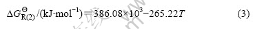 这将导致反应过程中缺少氯原子与TiO2发生卤化反应,不能形成TiCl3参与晶须的合成。而TiO2与碳黑、N2间会发生如方程(2)所示的化学反应形成TiN。利用自由能变化函数式(3)可算得方程(2)的最低反应温度。在1 000~2 000 K温度范围内,在标准状态压力下 (101 325 Pa),当T>1 456 K(即1 183 ℃)时,