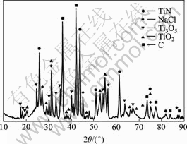 图1所示为粉末原料经1 200 ℃保温180 min后的X射线衍射谱。可见,粉末的相组成为TiN、Ti的氧化物、NaCl和碳黑。由于添加量少,没有发现催化剂NiCl2的衍射峰。尽管NaCl的熔点为802 ℃,然而从图1中可以发现,NaCl仍具有较强的衍射峰,这与文献[11]报道的情况一致。在1 200 ℃的N2气氛中,NaCl具有很好的稳定性,不会发生如式(1)的分解反应: