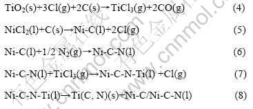 形成含有Ti原子的TiCl3气体,成为按“气-液-固”机制合成Ti(C, N)晶须所需的钛源。而在此温度下催化剂NiCl2会与碳黑发生如式(5)所示的反应,形成Ni-C共晶液相,并为多相反应系统提供Cl原子;形成的Ni-C共晶液相又与N2发生如式(6)所示的化学反应,形成Ni-C-N共晶液相;然后,Ni-C-N共晶液相与TiCl3发生如式(7)的反应,形成Ni-C-N-Ti液相,并释放Cl原子;当催化剂Ni中的C、N、Ti原子达到一定的过饱和度后便按式(8)析出Ti(C,N)相。然而在此温度下TiO2与碳黑、N2间的直接还原反应依旧是主要反应,在X射线衍射谱中TiN相的衍射峰仍旧是最强的,就反应了这一点。