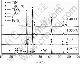 随着合成温度升高至1 300 ℃,样品中依然存在TiN相的衍射峰,但TiN的衍射峰强度明显减弱,Ti(C,N)的衍射峰逐渐增强,说明在此温度下反应(2)已经成为次要的反应,而催化合成反应成为主要的反应;随着温度进一步升高到1 350和1 400 ℃,TiN相的衍射峰完全消失,而Ti(C,N)相的衍射峰成为主要的衍射峰。因此,在较高温度下,催化还原反应是主要反应,而对TiO2与碳黑、N2间的直接反应有明显的抑制作用。此外,从X射线衍射谱可以发现,在1 250 ℃合成的样品中仍残留Ti的氧化物和碳黑;而在 1 300 ℃合成的样品中,Ti氧化物相的衍射峰已经消失,并开始出现催化剂的衍射峰;随着温度升高到 1 350和1 400 ℃,催化剂相的衍射峰强度越来越高,这表明随着合成温度的升高,反应(4)进行得更充分。从X射线衍射谱可发现催化剂的组成是FeNi3相,而不是根据反应式(8)形成的Ni相,这是因为混料过程中采用不锈钢球研磨引入了铁杂质,在合成条件下形成了FeNi3相。