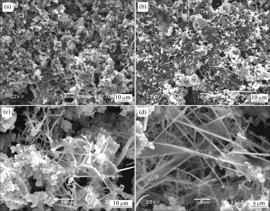 图3所示是经不同温度合成的粉末样品形貌图。图3(a)所示为经1 200 ℃合成的粉末样品形貌图。根据X射线衍射分析结果可知,合成粉末由颗粒状的TiN、Ti的氧化物、NaCl和残留的大量疏松状碳黑组成,没有出现晶须,说明在此温度下合成晶须的催化还原反应没有发生。图3(b)所示为经1250℃合成的粉末样品形貌图。可以发现,在此温度下合成的样品中已经有少量的晶须存在,说明在此温度下晶须的催化合成反应已经进行;然而,样品仍由残留的碳黑与晶须及颗粒组成,这与X射线衍射分析的结果相一致。图3(c)所示为经1 300 ℃合成的粉末形貌图。与图3(b)比较可以发现,合成的样品粉末中几乎没有残留的碳黑,晶须的数量也明显的增多,但是样品中有较多团聚的颗粒与晶须混杂在一起,晶须的长度为10~ 15 ?m,直径在1 ?m左右。图3(d)所示为1 400℃合成的粉末形貌图。可以发现,晶须的数量较多,而且晶须交织在一起,团聚颗粒的数量明显减少。与图3(b)、(c)相比,图3(d)中晶须的长度明显增长,达到30 ?m左右,而直径仍在1 ?m左右。此外,从图中还发现,晶须的生长需要一定的生长空间,这也是为什么在原料选择时采用粉末样,而不采用压坯的原因,并且粉末样的比表面积较大,能够吸附更多的反应气体,也便于晶须的生长。通过比较图3(a)、(b)、(c)、(d)中合成粉末样品的组成及晶须的数量,可以发现合成温度对合成粉末的相组成、晶须的数量及长度有着重要的影响,反应温度越高,晶须的数量越多,长度越长,并且粉末样品中残留的碳黑含量也越少,在 1 400 ℃时合成的样品中已经没有残留的碳黑存在。