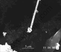 2) 合成的晶须长度在15~30 ?m之间,直径大约 1 ?m;晶须表面光滑,顶端残留有催化剂颗粒,具有典型的气-液-固生长机制特征。