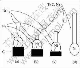 Ti(C,N)晶须的生长模型如图5所示。生长的具体过程为:首先,由反应(5)和(6)生成含有C、N原子的Ni-C-N共晶小液滴;反应(4)产生的TiCl3气体与Ni-C-N共晶小液滴接触,通过气—液界面扩散到催化剂小液滴中,使催化剂小液滴成为含有形成Ti、C、N原子的熔体,如图5(a)所示。当熔体达到一定的过饱和度