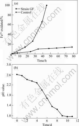 Fig.4 Ferrous iron(a) and sulfur oxidation (b) by strain GF