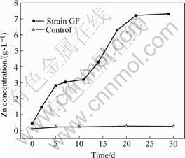 Marmatite is an important zinc ore in China, but it is difficult to be processed effectively by traditional technologies due to its high content of iron[20]. The bioleaching of marmatite flotation concentrate by A. ferrooxidans has been proved to be very useful in mineral processing[21]. Two leaching runs were used for investigating the leaching efficiency of strain GF: the steriled control and the adapted strain. The experiment results are shown in Fig.6. The extraction of zinc was markedly different between them at the very start. The Zn concentration was 0.273 g/L under the steriled control and 7.302 g/L with the adapted strain GF incubated for 29 d. Strain GF could increase markedly the leaching rate of marmatite compared with the steriled control.