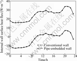 For evaluating the effects of the embedded pipes on the heat transfer of the pipe-embedded wall, the heat transfers and the internal wall surface temperatures of the pipe-embedded wall and the conventional wall are compared, respectively. For the pipe-embedded wall, the pipe spacing is 200 mm, and the inlet water temperature is 21 ℃.