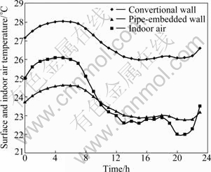 Figure 4 shows the internal surface temperature profiles of the conventional wall and the pipe-embedded wall. For the conventional wall, the maximum temperature difference between the internal surface and the indoor air is 4.10 ℃, and the minimum is 1.88 ℃. The absolute average temperature difference is 2.93 ℃. However, for the pipe-embedded wall, the maximum temperature difference between the internal surface and the indoor air is only 0.81 ℃, 3.29 ℃ lower than that of the conventional wall. The absolute average temperature difference is 0.72 ℃, 2.21 ℃ lower than that of the conventional wall. The lower temperature difference between the internal surface and indoor air indicates that the heat radiation from the surface is less, and the indoor thermal performance may be improved significantly by using pipe-embedded building envelopes in real building system. Obviously, the lower surface temperature results in less energy consumption for air conditioning systems.