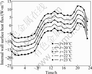 The pipe spacing of 200 mm in the pipe-embedded wall model is used for analyzing the effects of the water temperature on the wall heat transfer. Figure 5 shows the internal wall surface heat flux profiles at different water temperatures. The water temperatures are from 19 to 23 ℃ with the step of 1 ℃. Figure 5 demonstrates that the heat flux from the wall surface to indoor air reduces as the water temperature decreases. The heat flux reduces by about 2.6 W/m2 when the water temperature decreases by 1 ℃. Particularly, when the water temperature is bellow 20 ℃, the internal wall surface basically absorbs heat from indoor air in the most time of 1 d. The total heat transfer amounts (i.e., the summation of the heat transfer in one day) are -0.72, -0.49, -0.25 and -0.03 MJ/m2 for the water temperatures of 19, 20, 21 and 22 ℃, respectively. This means that the wall absorbs heat from indoor air at these water temperatures from the view point of 1 d. When the water temperature is 23 ℃, the total heat transfer amount is 0.19 MJ/m2 for 1 d, only 9.1% of the heat transfer of the conventional wall (2.09 MJ/m2). The maximum heat flux of the pipe- embedded wall is 11.98 W/m2 when the water temperature is 23 ℃. It is about one third of the maximum heat flux of the conventional wall (33.88 W/m2).