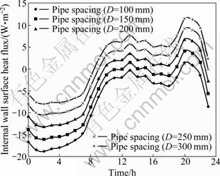 Fig. 6 Internal wall surface heat flux profiles of pipe-embedded wall at different pipe spacing