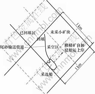 (3) 输送上岸粗选:输送原矿上岸粗选,然后再将占原矿98%以上的尾矿输送回采空区回填,来回输送量太大,还需在岸上专门布置堆场,运输、维护成本太高。本方案不予采用。