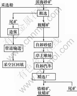 将砂泵吸扬的矿砂经过选矿设备粗选,得到的尾砂通过输送泵加压,经排砂管、浮管连接头以及原矿输送管道输送到采空区回填。粗精矿由自卸砂驳运往岸边。