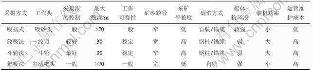本矿区矿层为粉细砂~粗砂,主要赋存于水深10~30 m间的地层中,基本无顶板围岩,底板围岩与矿层清晰易辨,界线清楚,可直接采用现有浅海采砂工艺开采。目前最常用的采掘方式,根据结构性能的不同,可分为吸扬式、绞吸式、斗轮式和耙吸式[7]。其性能比较如表2所示。综合本矿区砂矿赋存形态、船舶造价、采矿工艺和采矿成本等因素,在本项目开采中,采用吸扬式采集法。