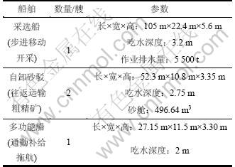 采区工作的主要船舶有:1艘采选船,2艘自卸砂驳,各船上人员的通勤,船舶淡水、油料的输送以及无动力船舶的移动等由多功能船舶来实现,如表3 所示。
