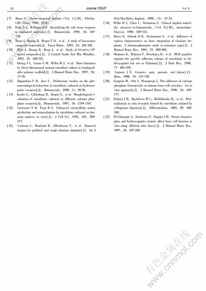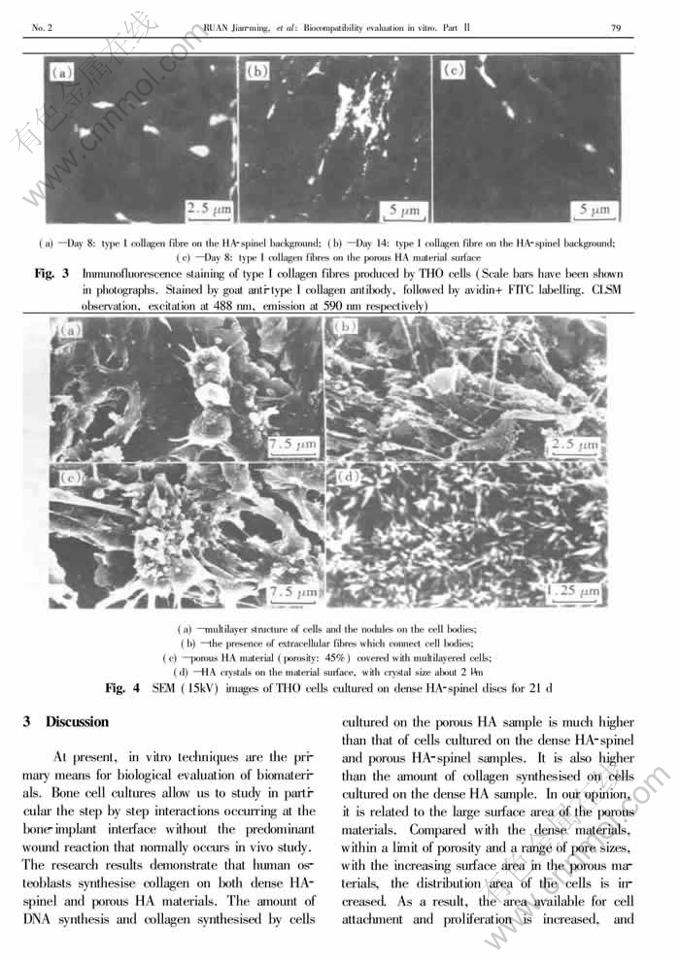Abstract: DNA synthesis and collagen formations on the implantmaterial by cell culture in vitro are the most important phenotypical expression to estimate the biocompatibility. In this part, DNA synthesis and collagen formation on implantmaterials were quantitatively and qualitatively estimated by radioactive is otope H+-thymi-dine to incorporate into DNA chains, H+-proline to incorporate into type I collagen proteins followed by scintillation counting and antibody-antigen immunocytochemistry staining, respectively. Research results demonstrate that hydroxyapatite (HA) stimulates DNA synthesis and collagen formation on the material whereas this stimulation is restricted by adding spinel to the materials. There are statistical differences between the influences of material components on both DNA synthesis and collagen formation. It is supposed that porousmaterials can supply more platforms for cell anchoring, and more DNA and collagen are synthesised on the porous materials. Immersion in culture medium results in new HA crystal formation on the porous HA materials.