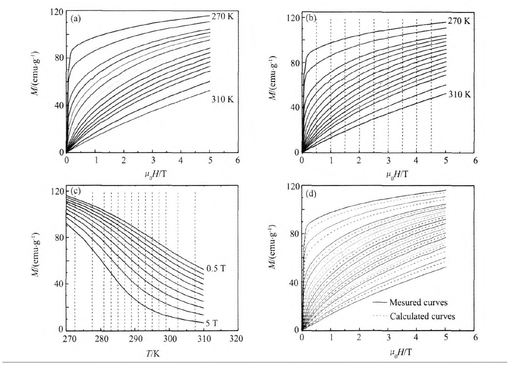为减少磁熵变数值计算的误差,并降低实验成本,通过对M-H曲线进行温度插值处理得到温度间隔更小的M-H曲线,方法如下:(1)实验测得的一组M-H曲线如图1(a)所示,在曲线上插值可得到在同一温度下更详细的(H,M)数据,如图1(b)所示;(2)用(1)中得到的数据画出样品的M-T曲线,再对其进行插值,就可得到在同一磁场下更详细的(M,T)数据,如图1(c)所示;(3)用(2)中得到的数据就可以画出温度间隔更小的M-H曲线,如图1(d)所示。其温度间隔取决于(2)中插值点的选择。