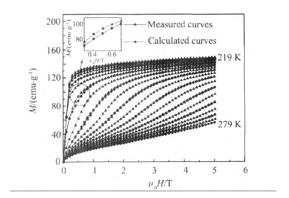 为了检验这种方法的有效性,可以分别对3类曲线进行处理,将原始数据部分温度下的曲线去掉,再用剩下的曲线通过插值变换的方法得到温度下的曲线,跟原始的实验曲线作对比;用插值得到的曲线根据前差商方法计算磁熵变,与在原始数据下直接按照前差商方法计算的磁熵变数值进行对比。