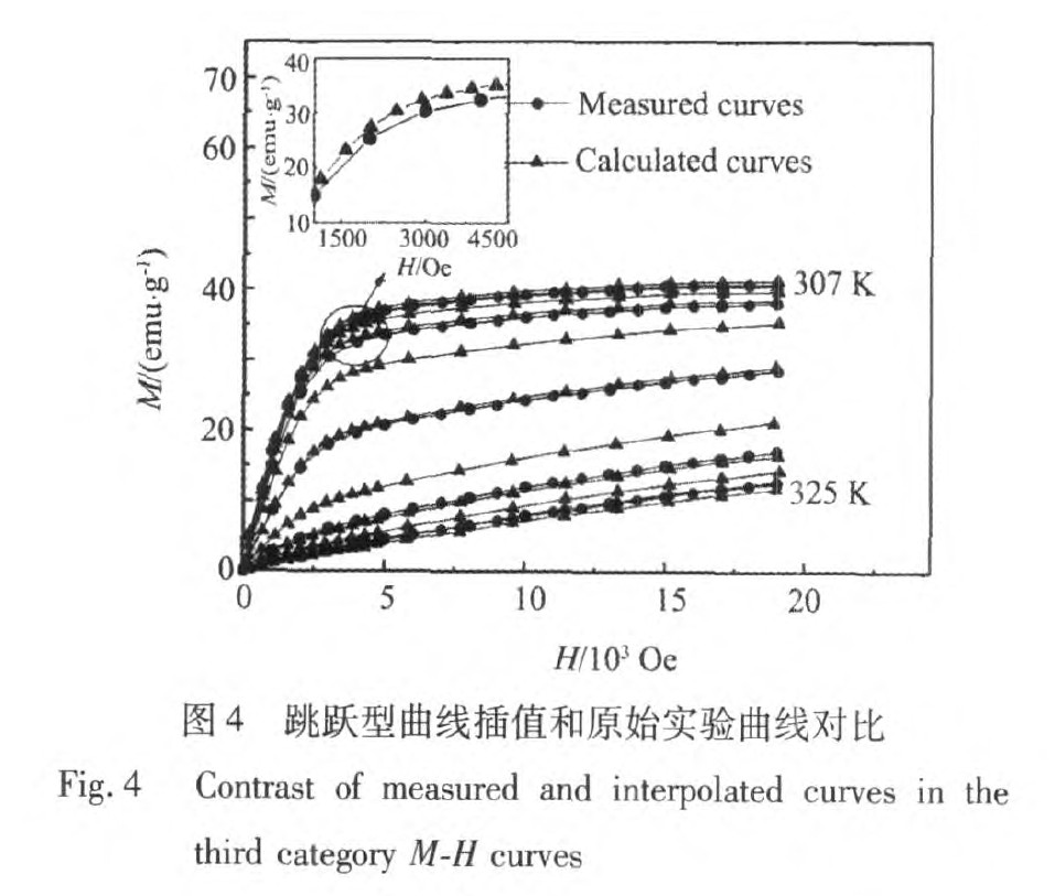 图2~4给出3类曲线通过温度插值得到的M-H曲线与原始曲线的对比。从图中可以看出,一般型M-H曲线和S型M-H曲线通过温度插值得到的曲线和原始实验曲线相比都有很好的重合性,而跳跃型M-H曲线在相变温度附近略有偏差。其原因为跳跃型M-H曲线在居里温度附近M-H随温度变化太剧烈,导致插值有误差。