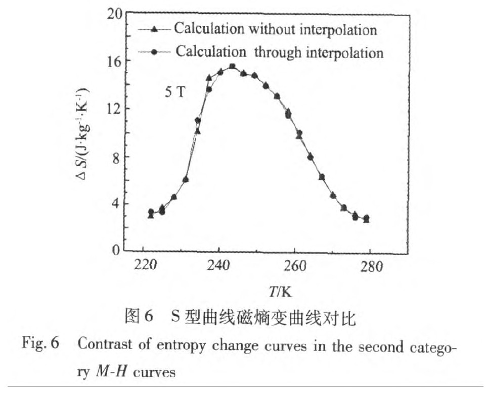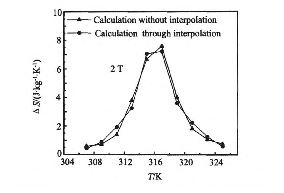 指出,M-H曲线的温度间隔越小,计算得到的磁熵变值误差就越小。然而实验上无限制的降低温度间隔就要受到热扰动的影响,从而使误差增大;另一方面降低温度间隔使得实验成本偏高。通过对温度间隔较大的M-H曲线进行插值变换,理论上可以得到温度间隔较小的M-H曲线,这样不但可以提高磁熵变化值的精度,而且避免了热扰动的影响,同时节约了实验成本。
